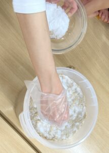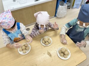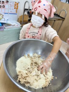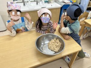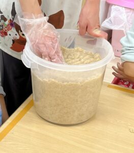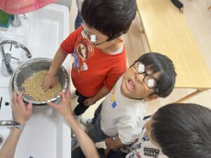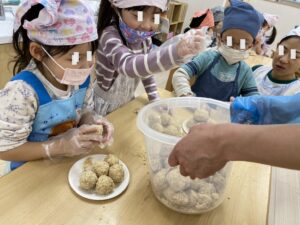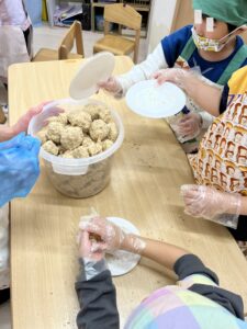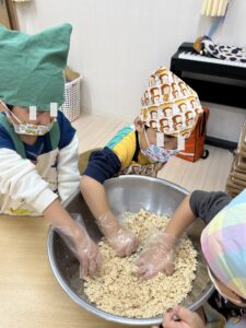 茹でた大豆を袋に入れて一生懸命つぶす子どもたち。