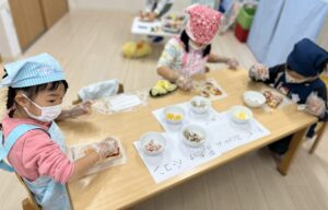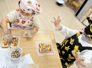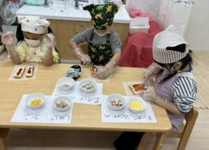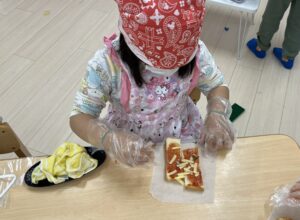 4歳児クラスでパンピザ作りをしました🍕具材は、ベーコンやきのこにコーンなど…