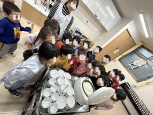 炊飯器を廊下に置いて「新米」を炊きました。すると、炊き上がるお米のにおいが保育室まで広がり…