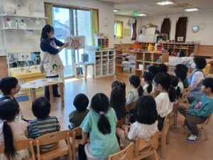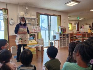 始めは、紙芝居やスライドを使って、一見綺麗に見える手にも見えないバイ菌がついていることを学び、興味深々に聞いていました。