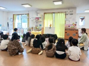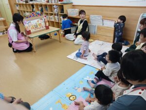 乳児クラスさんは、お腹にまつわる紙芝居を読んだ後に、うんちが出るための体操をして、体を動かしました。