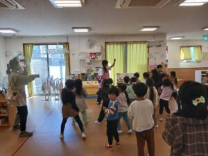 幼児クラスさんには、お姉さんとぽんたくんというお腹の中のキャラクターが遊びに来てくれ、