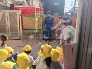 その後は、消防訓練として保育者の消火器の訓練や、消防車の見学をしました。