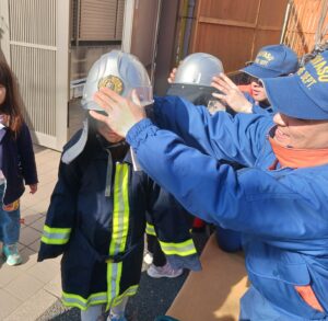 特別に防護服を着させてもらい、大きなヘルメットや重たい服に驚きながらも、気が引き締まっている子どもたちでした。