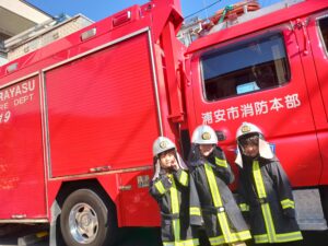 最後は、消防車をバックに記念撮影!消防車の中には、見たことないような物がたくさんあり、興味津々で観察していました。