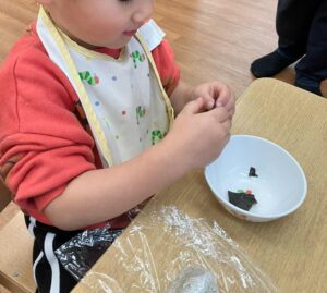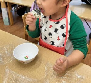 食育活動として、おやつのおにぎりの海苔つけをしました。