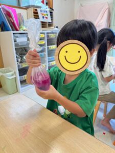 透明なお水がきれいなお花の色に変わると子どもたちも大興奮!