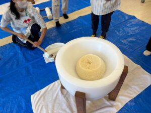 試食後は蒸しあがったもち米を臼に移して、「つぶし」を先生たちで行いました。