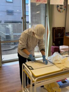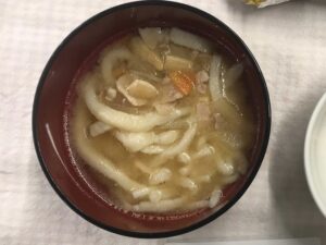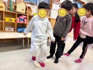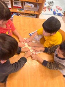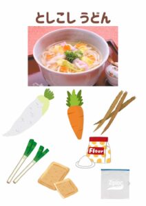 2026.01.09 舞浜こどもの木 幼児クラス食育活動 年越しうどんを作りました 12月最後の登園日に幼児クラスで年越しうどんを作りました。 給食室の先生に材料を教えてもらい、まずは年長さんがお買い物へ。 うどん作り。 小麦粉、塩、水を袋に入れてまぜまぜ。 混ざるとだんだん感触が変わっていくのに気づきました。 材料がよく混ざったら、袋の上からみんなで順番に 踏みました。 「おいしくなーれ」 良いかたさになったら、給食の先生に切ってもらいました。 こしが強くてとっても美味しいおうどんでした。 自分たちで作ったおうどんのお味は格別、 たくさんおかわりをしていました。