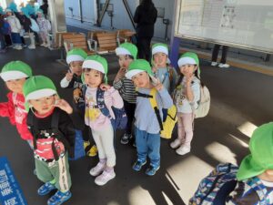 さあ、いよいよ出発です!電車の中では公共、交通のルールやお約束を守りながら静かに乗車していた子どもたちでした。普段見慣れているレストランなどの看板が見えると、「あ、〇〇だ!」と嬉しそうに友だちと会話をしていました。