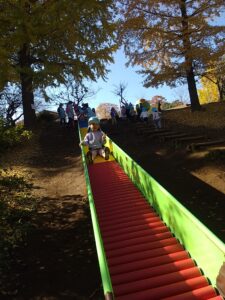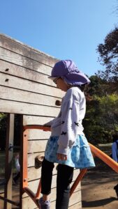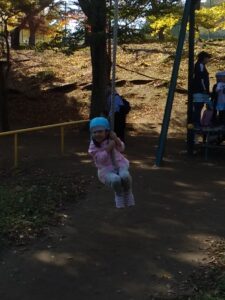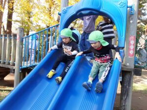 この日は天気も良く、秋の心地よい日差しを浴びながら、繰り返し滑り台を滑ったり、ターザンロープをしたり、アスレチックで思い切り身体を動かして遊んでいました。