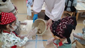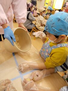 つぶした大豆を丸めていき、味噌桶にきりん・らいおん組さんが代表して入れました。桶の底をめがけて思い切り投げて入れていきます。