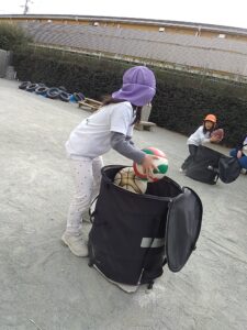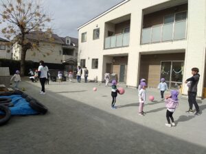 他にもボールをかごに入れるリレーをしたり、様々なボールを使って自由に遊んだりと、寒さを吹き飛ばしてしまうくらい元気いっぱいに、伸び伸びと身体を動かして遊んでいました。