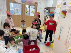 らいおん組さんの鬼が入ってきてボールで豆まきをしました!